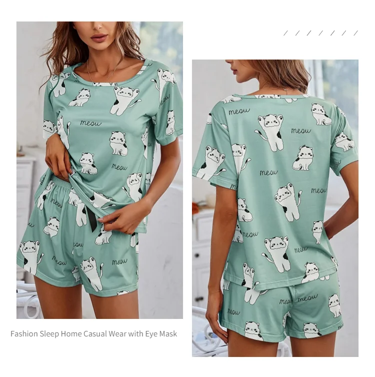 Impressão de desenhos animados, gola redonda, conjuntos curtos, pijamas fofas